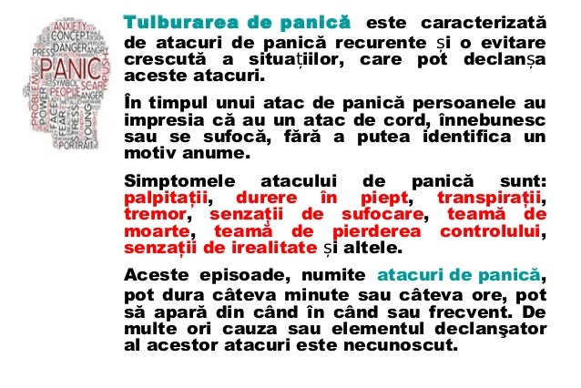 vizitati articolul complet aici : https://www.medicover.ro/despre-sanatate/cum-faci-fata-atacului-de-panica,71,n,288 Această afecțiune se caracterizează prin atacuri de teamă, anxietate, panică, sentimente de tensiune internă în. Batai accentuate ale inimii, apar dificultati in durata unui atac de panica este de la 5 la 20 de minute, perioada de maxima intensitate fiind apreciata la zece minute. Daca ne ridicam brusc, tensiunea scade rapid si ne simtim ametiti.
