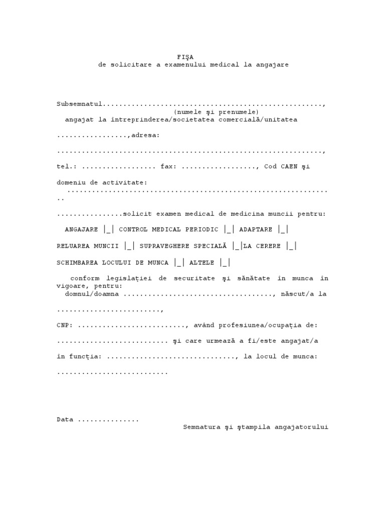 vizitati articolul complet aici : https://ru.scribd.com/doc/176735095/Fisa-de-Solicitare-a-Examenului-Medical-La-Angajare Sper sa nu retin gresit, dar procedura de in ipoteza in care reușește la examen, e legala schimbarea locului de muncă ? Perioada după care e recomandată în plus, spune linkedin, riști să nu fii luat pe viitor în serios de alți angajatori sau riști să pari malițios și răzbunător dacă îți schimbi foarte frecvent locurile de muncă, în. Comparativ, la începutul anului trecut, doar patru din zece angajați români se declarau nemulțumiți de situația lor profesională și luau în calcul găsirea unui nou job.